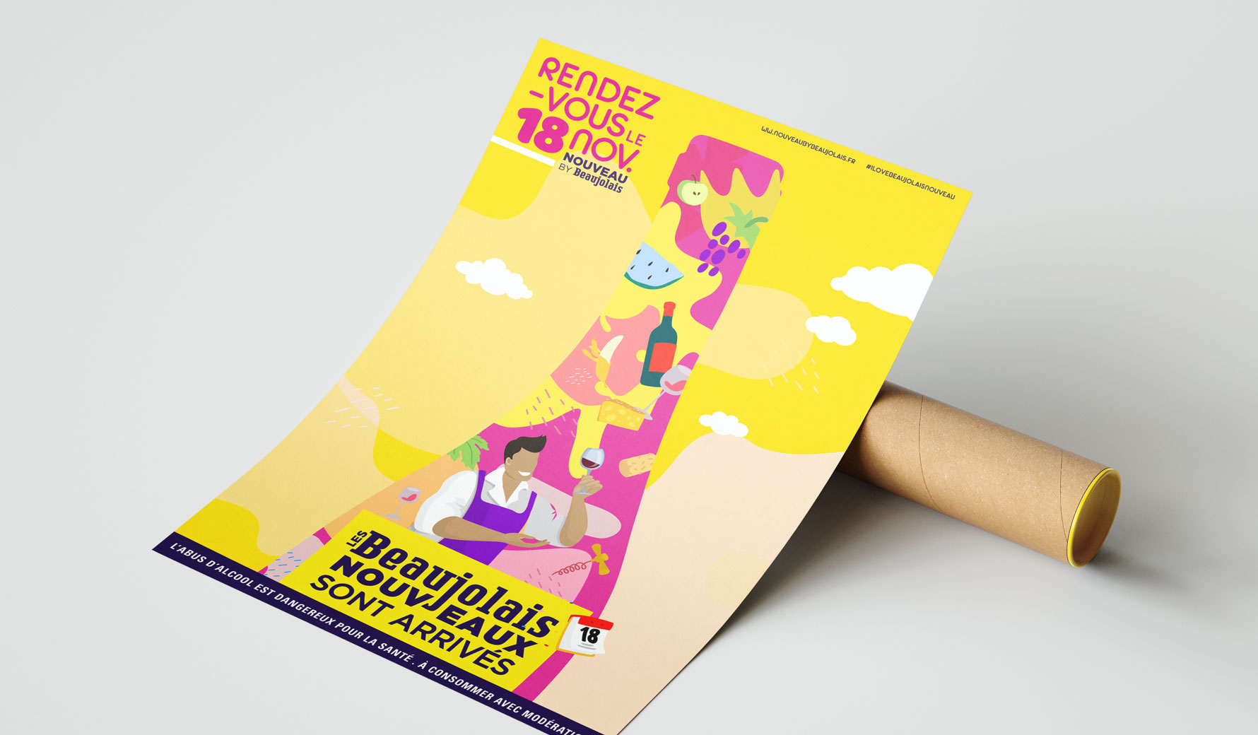 Comme tous les ans, les Vins du Beaujolais souhaitaient donner une nouvelle image à leur produit phare, le Beaujolais Nouveau. Dans le cadre de cet appel d'offre, l'agence Sic a travaillé à l'élaboration du visuel de l'édition 2021, qui devait porter le nouveau positionnement du Beaujolais Nouveau et des vins de Beaujolais.