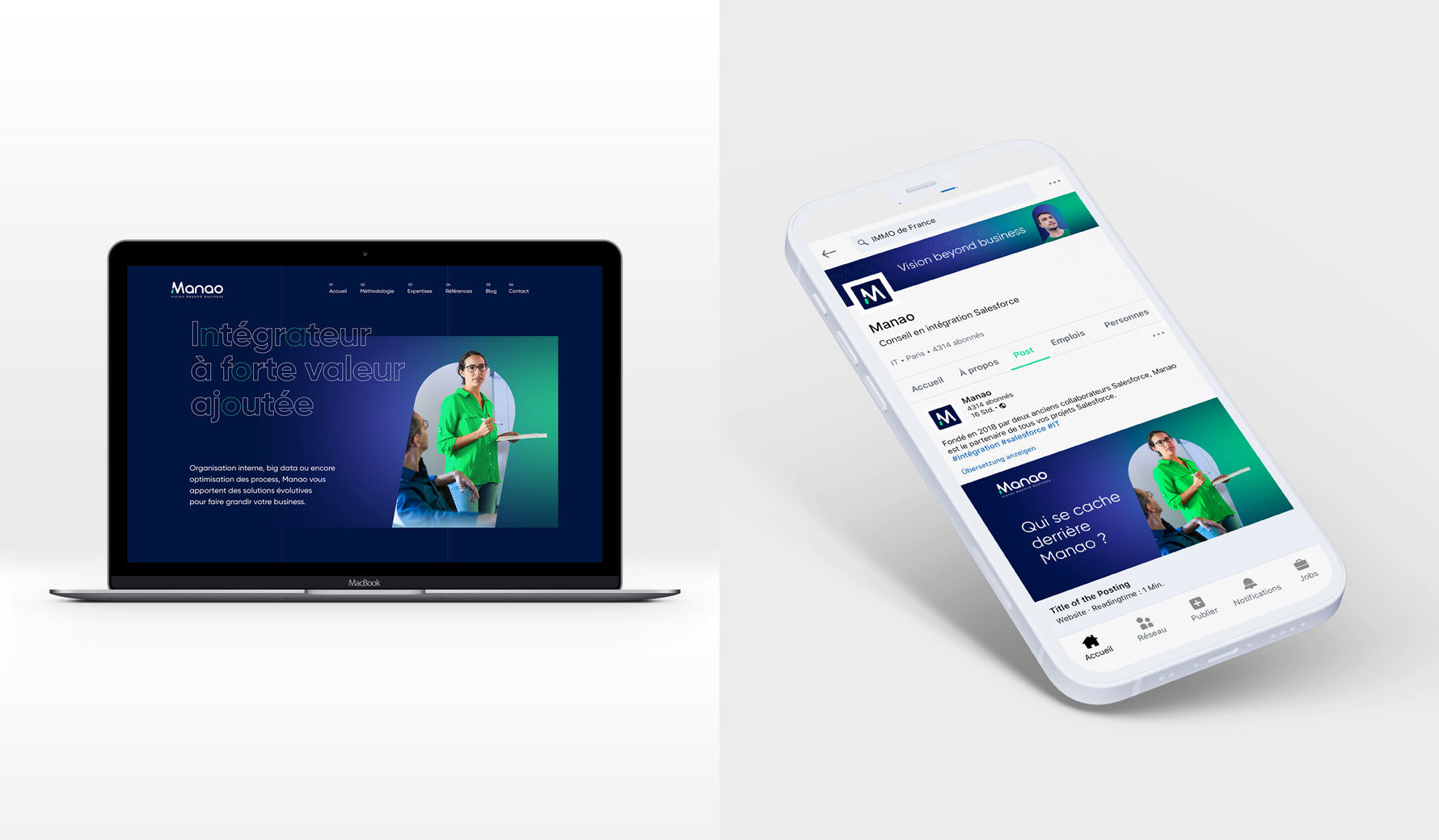 Manao est un pure player Salesforce fondé en 2018 par deux anciens collaborateurs Salesforce. Deux profils complémentaires, une vision commune : aller au bout de chacun de leurs engagements pris auprès de leurs clients. Tout simplement. Sic a repenser l'univers graphique de la marque en commençant par la création de son nouveau logo.